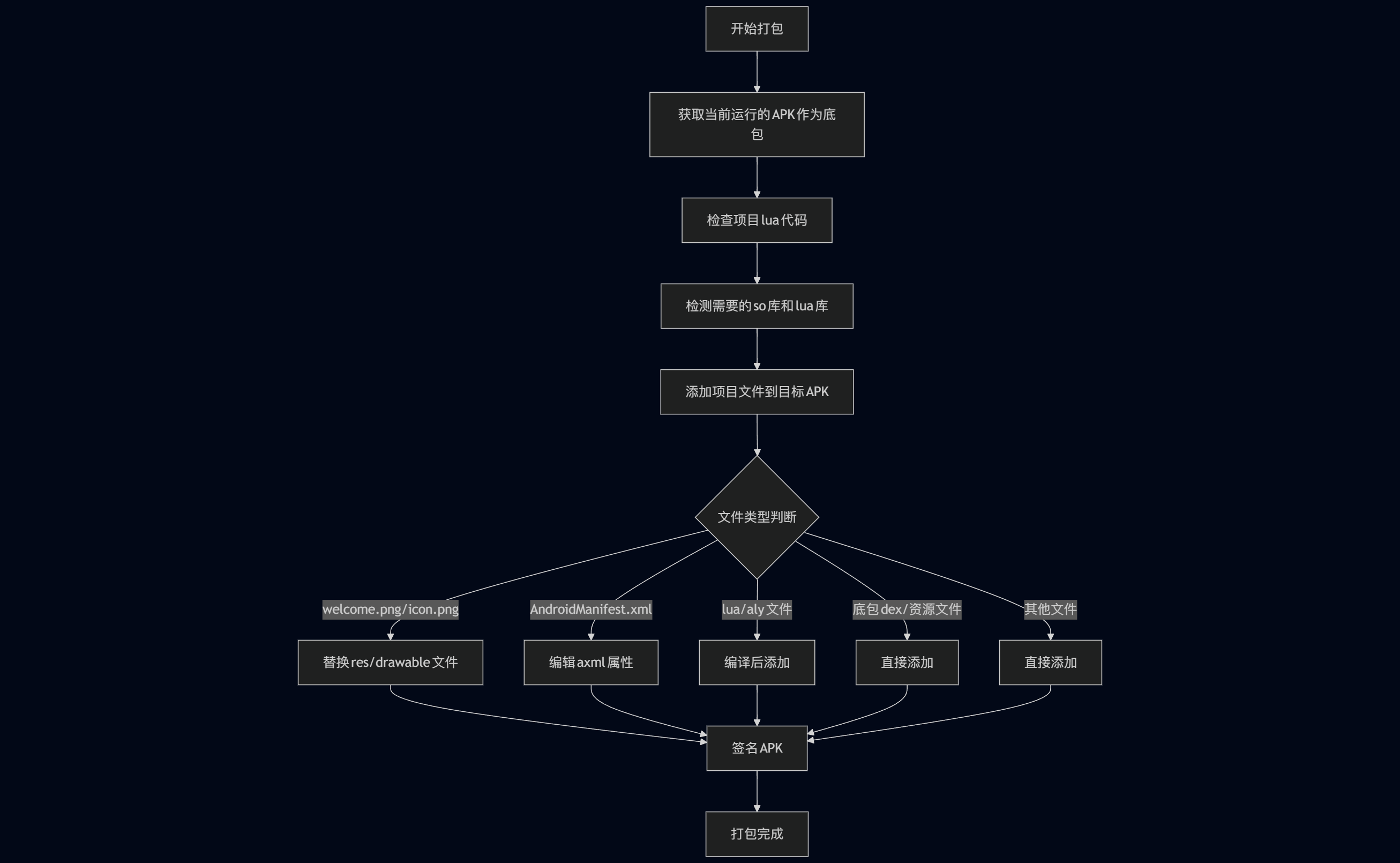 this.update("正在打包..."); local entry = zis.getNextEntry(); while entry do local name = entry.getName() local lib = name:match("([^/]+%.so)$") if replace[name] then elseif lib and replace[lib] then elseif name:find("^assets/") then elseif name:find("^lua/") then elseif name:find("META%-INF") then else local entry = ZipEntry(name) out.putNextEntry(entry) if entry.getName() == "AndroidManifest.xml" then if path_pattern and #path_pattern > 1 then path_pattern = ".*\\\\." .. path_pattern:match("%w+$") end local list = ArrayList() local xml = AXmlDecoder.read(list, zis) local req = { [activity.getPackageName()] = packagename, [info.nonLocalizedLabel] = appname, [ver] = appver, [".*\\\\.lua"] = "", [".*\\\\.luac"] = "", } if path_pattern==nil or path_pattern=="" then req[".*\\\\.alp"] = "" req["application/alp"] = "application/1234567890" else path_pattern=path_pattern:match("%w+$") or path_pattern req[".*\\\\.alp"] = ".*\\\\."..path_pattern req["application/alp"] = "application/"..path_pattern end for n = 0, list.size() - 1 do local v = list.get(n) if req[v] then list.set(n, req[v]) elseif user_permission then local p = v:match("%.permission%.([%w_]+)$") if p and (not user_permission[p]) then list.set(n, "android.permission.UNKNOWN") end end end local pt = activity.getLuaPath(".tmp") local fo = FileOutputStream(pt) xml.write(list, fo) local code = activity.getPackageManager().getPackageInfo(activity.getPackageName(), 0).versionCode fo.close() local f = io.open(pt) local s = f:read("a") f:close() s = string.gsub(s, touint32(code), touint32(tointeger(appcode) or 1),1) s = string.gsub(s, touint32(18), touint32(tointeger(appsdk) or 18),1)